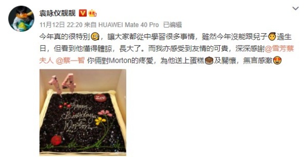 由于有工作在身,袁咏仪未能陪伴儿子过生日,她在微博发文感谢好友蔡一智夫妇为儿子准备了生日蛋糕,“今年真的很特别,让大家都从中学习很多事情,虽然今年没能跟儿子过生日,但看到他懂得体谅,长大了。”