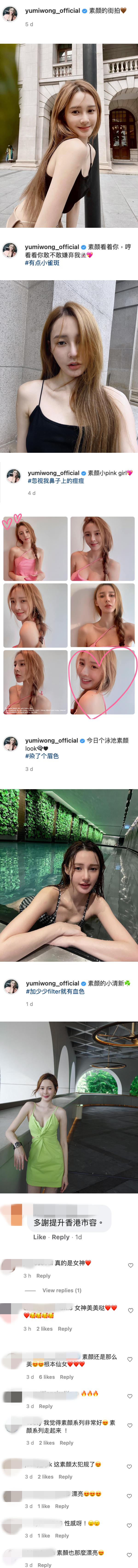 黄诗棋近日在社交平台上晒出了“素颜的街拍”、“素颜小雀斑”、“素颜小pink girl”、“泳池素颜look”、“素颜的小清新”、“素颜出海look” 等系列美照,获得了许多网友的盛赞:“真的是女神”、“国民女神”、“素颜还是那么美”、“我觉得素颜系列非常好” 、“多谢提升香港市容” 等。
