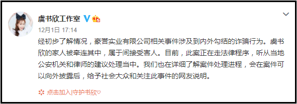 虞书欣工作室昨天第一时间回应,指虞书欣妈妈的公司受到内外勾结的诈骗,属于间接受害人,案件目前仍在走法律程序。