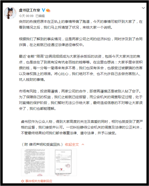 工作室其后在凌晨二度发文,表示这起案件是两家公司之间的经济纠纷,且涉及合同诈骗,已通过法律途径维权,并强调:“大家手里辛苦积攒的钱,每一分每一毫得来有多不易,我们也深有体会,也感受过被蒙骗的伤害以及维权路上的艰难。将心比心,我们绝对不会、也不允许自己去做伤害别人、坑人钱财的事情。”