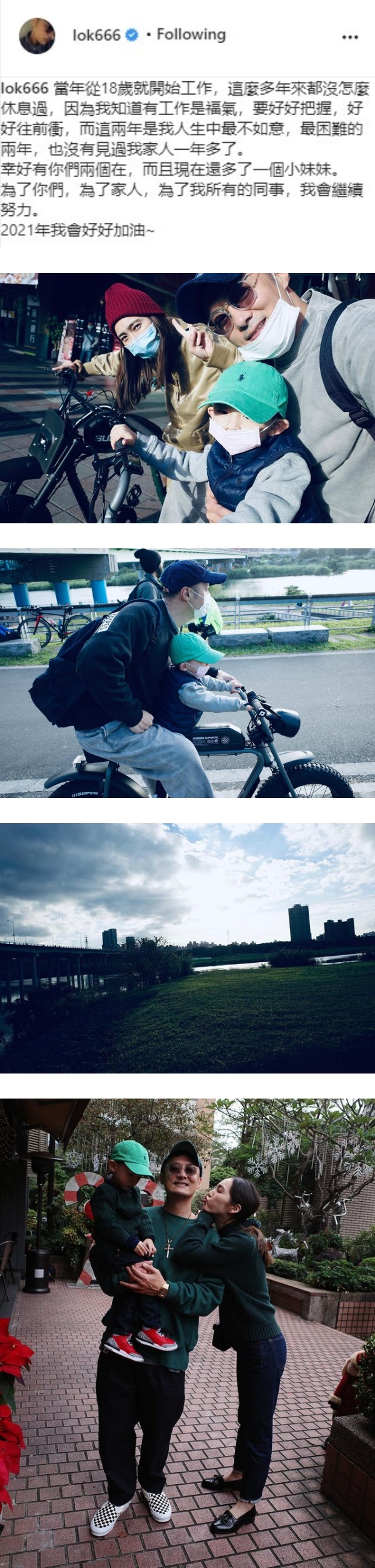 所幸,在这艰难的时刻,余文乐身边有太太和子女的陪伴,文末他写下,“为了你们,为了家人,为了我所有的同事,我会继续努力。2021我会好好加油~”;余文乐同时贴出多张和儿子、太太骑车的郊游照片,可见他如今相当享受家庭生活。