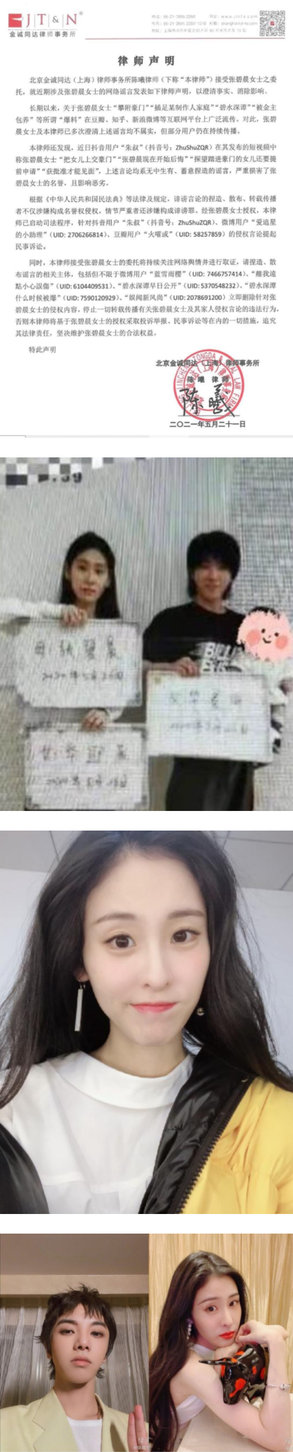 一名名为“朱叔”的抖音用户爆料,张碧晨后悔将女儿上交豪门,并且想探望女儿还得提前申请、获批准才能见面。张碧晨透过律师驳斥谣言,表示上述言论均为无中生有、蓄意捏造,造成张碧晨名誉严重损坏。