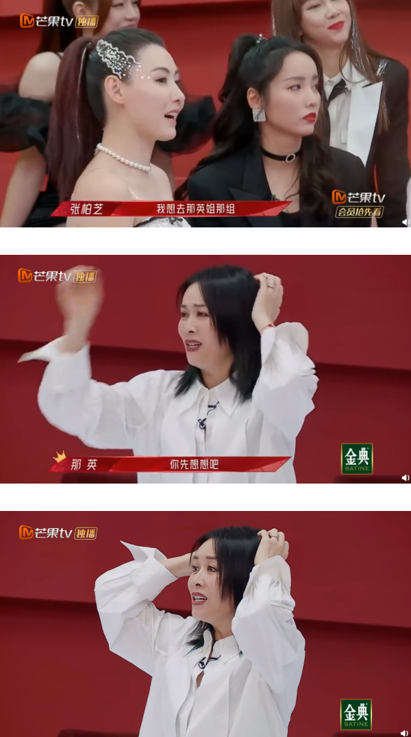 张柏芝在考虑一段时间后,选择加入那英组别,没想到那英听到后,吓得从椅子上弹跳起立,面露难色、惶恐地抱头,看起来非常为难,其后表示:“你先想想吧”,婉转拒绝了张柏芝的请求,让姐姐们都非常惊讶。