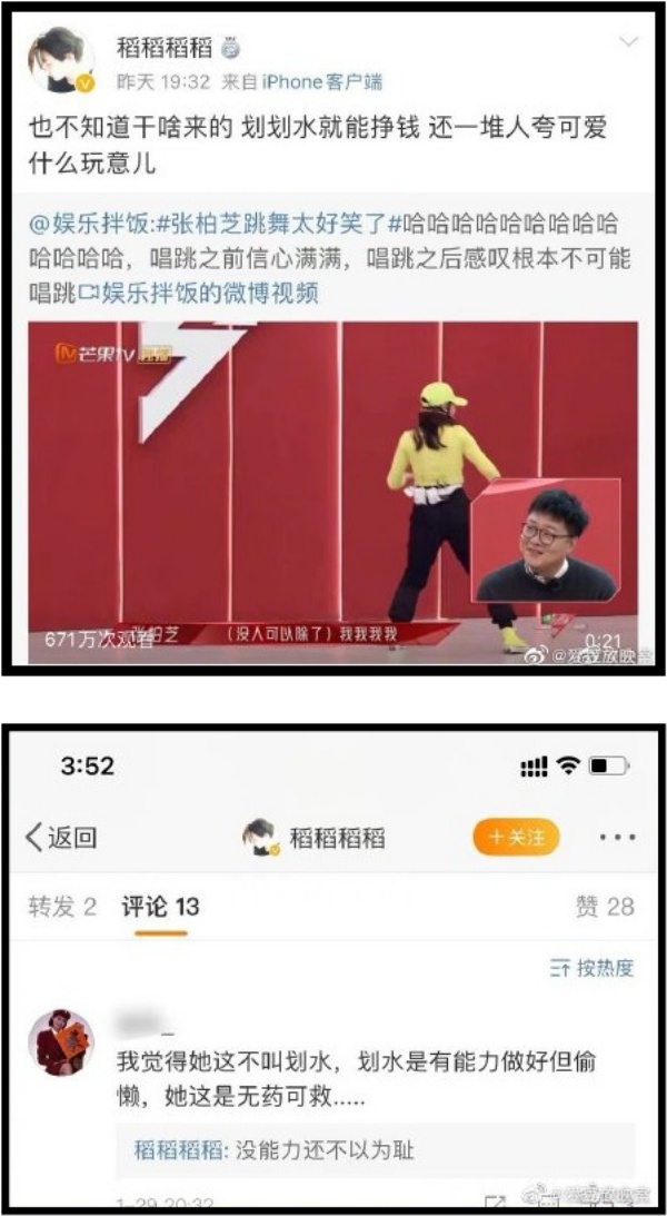 没想到,王菲好友“稻稻稻稻”却转发张柏芝跳舞的视频,嘲讽:“也不知道干啥来的,划划水就能挣钱,还一堆人夸可爱,什么玩意儿”,而在网友评论表示:“我觉得她这不叫划水,划水是有能力做好但偷懒,她这是无药可救”时,她更回应:“没能力还不以为耻。”