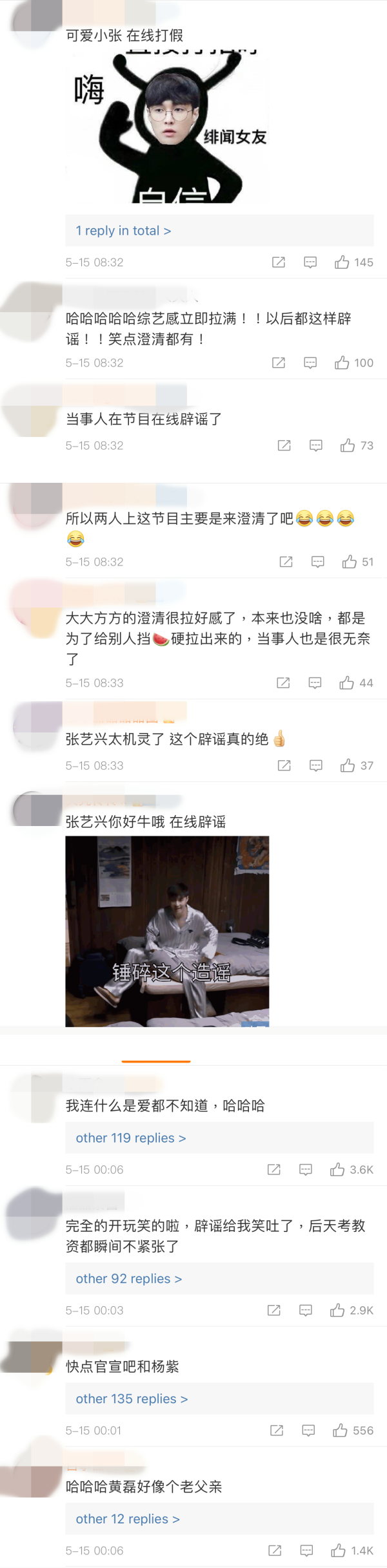 粉丝们纷纷留言:”当事人直接在线辟谣了“、”两人上节目主要是辟谣吧“、”笑吐了张艺兴绝了“、”教科书级别的辟谣!“等。