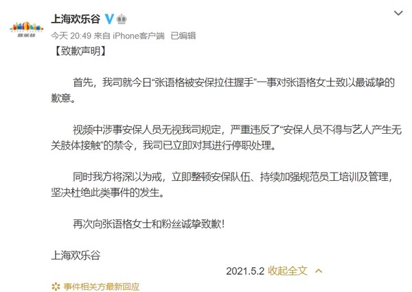 而主办单位也在当晚发布了道歉声明,表示已将涉事保安人员进行停职处理:“同时我方将深以为戒,立即整顿安保队伍、持续加强规范员工培训及管理,坚决杜绝此类事件的发生。”