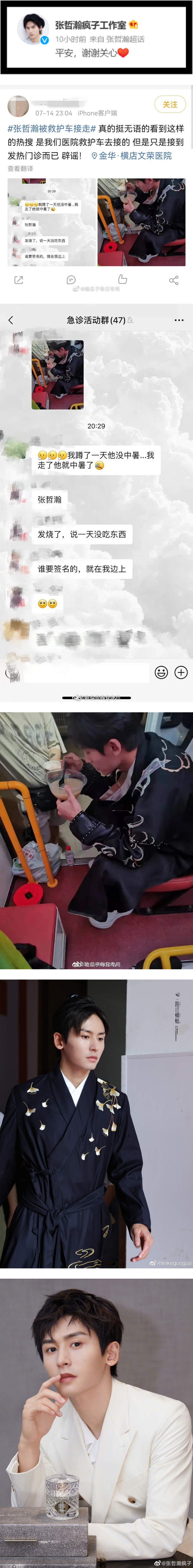 张哲瀚昨天在横店录制综艺节目《最后的赢家》,,没想到晚上却疯传他因中暑而被救护车接走的画面,“张哲瀚刚刚被救护车接走,什么情况这是!”