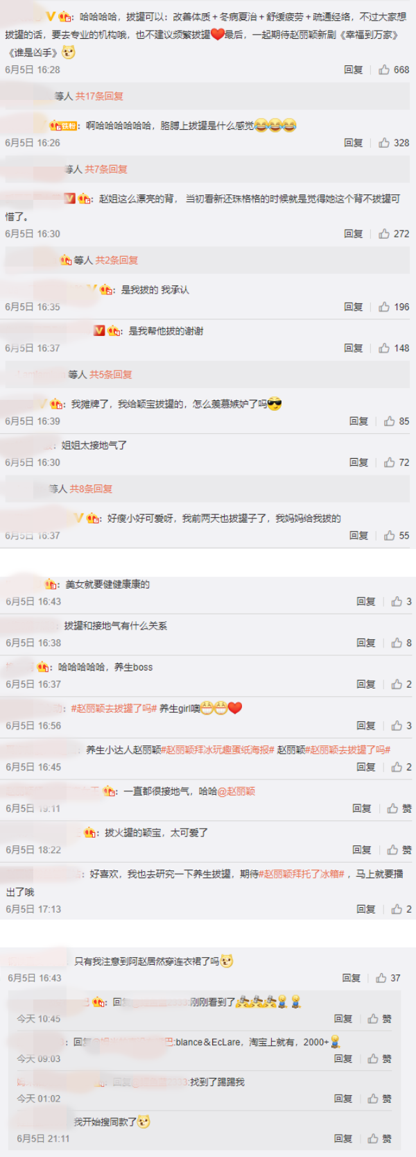 粉丝纷纷赞赵丽颖是养生girl、接地气:“赵姐这么漂亮的背, 当初看新还珠格格的时候就是觉得她这个背不拔罐可惜了”、“这跟接地气没关系 就是注重养生而已”、“美女就要健健康康的”、“养生小达人赵丽颖”、“看来湿气不怎么重,同个拔罐位置我是黑紫色”。