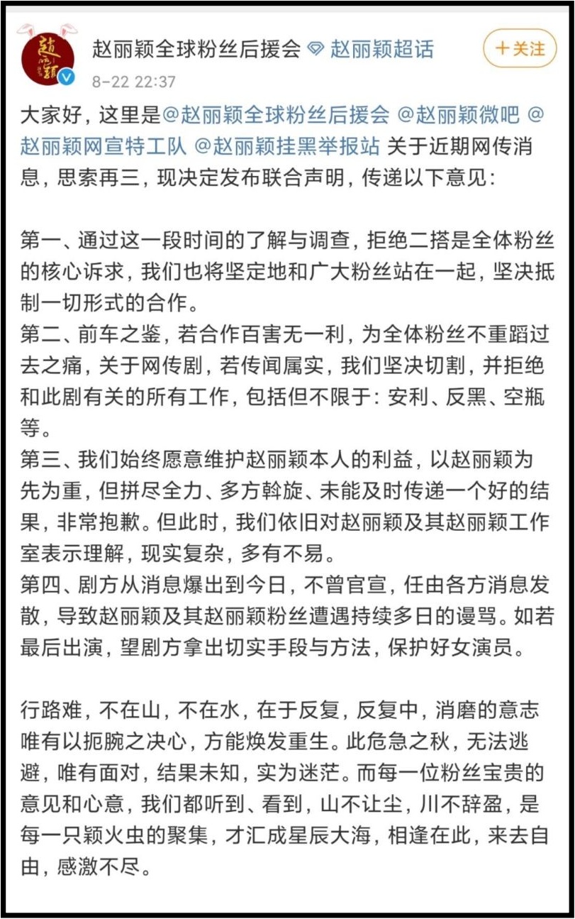 就在网友对后援会的反转感到迷惑时,微博管理员昨天(23日)傍晚发布公告:“明星赵某某粉丝在其新剧未有官方明确消息的情况下拉踩引战、宣扬抵制”、“站方再次郑重声明,严禁一切无底线、非理性的追星行为,坚决抵制宣扬对立,干扰企业正常工作的行为”,宣布禁言赵丽颖后援会、网宣特工队、微吧等多个官方站。