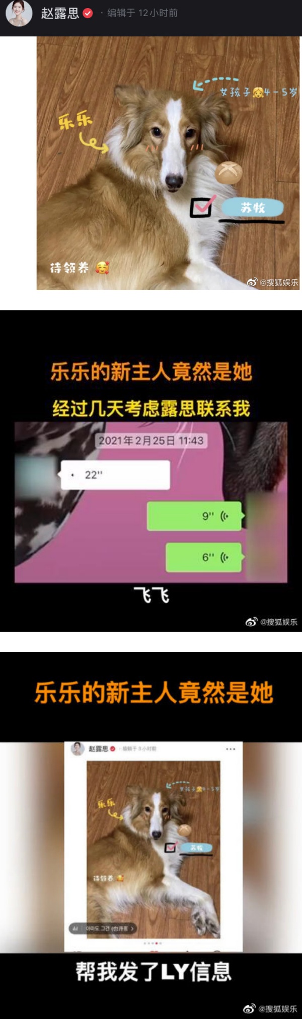 赵露思知道此事后,帮忙发布了领养信息。但一个月过去了,还是没有人愿意领养这只狗。于是她又联系网友,说自己可以领养这只特殊流浪狗。从网友曝光的信息看来,她很讶异小狗的新主人是赵露思,也很感谢她的帮忙。