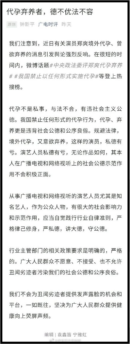 广电旗下的公众号《广电时评》昨天(20日)发文,严肃声明:“代孕不是私事,与法不合,有违社会主义公德。我国禁止任何形式的代孕行为,代孕、弃养更是违背社会公德和公序良俗。”