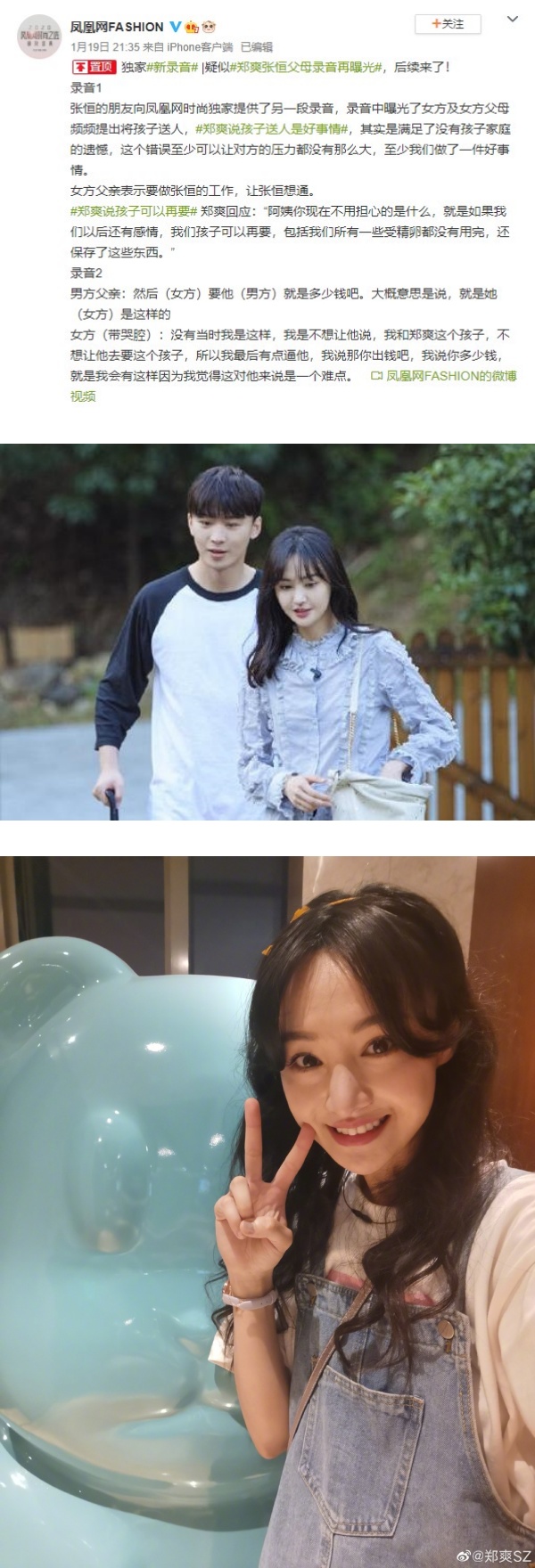 《凤凰网时尚》曝光的最新录音中,听到疑似郑爽、郑爽母亲以及张恒父母进行谈判。郑爽妈妈提出,“你俩感情不在,孩子就送人”,郑爽听到之后激动地认同,“(孩子送人)其实是满足那些没有小孩的家庭”、“至少我觉得这个错误,至少让对方压力不会那么大,因为我们做了一件好事。”