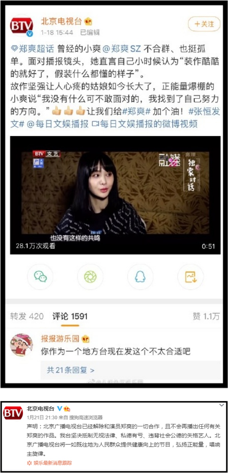 不仅如此,在郑爽出事首天,曾发文力挺、继续邀请她录制节目的北京电视台也改口,昨晚(21日)发文切割关系,指已经解除一切合作,也不会再播出任何有关她的作品,“坚决抵制无视法律、私德有亏、违背社会公德的失格艺人。”