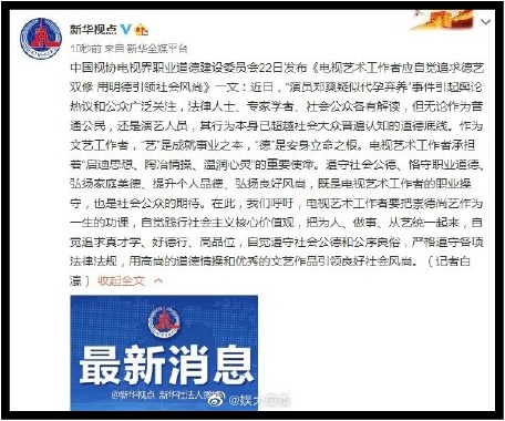 郑爽因被曝代孕、弃养等丑闻而遭广电总局点名封杀,中国视协电视界职业道德建设委员会今天(22日)也发文痛批:超越道德底线!