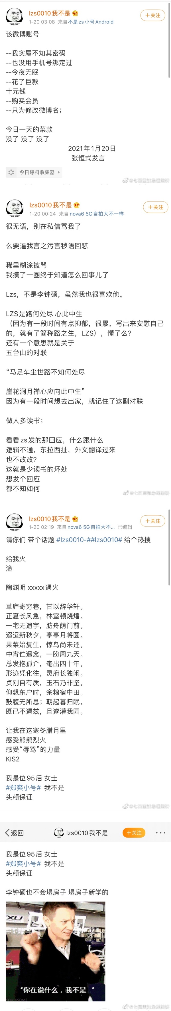 事后,“lzs0010”发文澄清指自己不是李钟硕,还为此花钱买微博会员、修改名称:“该微博帐号,我实属不知其密码,也没用手机号绑定过,今夜无眠。”
