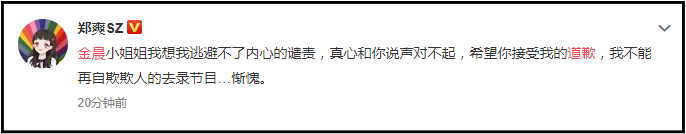 让人疑惑的是,她今天中午突然发文,向金晨道歉:“金晨小姐姐,我想我逃避不了内心的谴责,真心和你说声对不起,希望你接受我的道歉,我不能再自欺欺人的去录节目…惭愧。”
