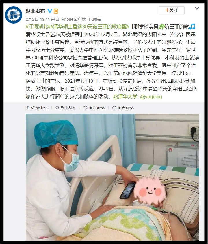 据报道,毕业于北京清华大学硕士班的岑姓男子去年12月7日因脑梗死导致重度昏迷,为了促醒,医生在了解到他对清华感情深厚,对王菲的音乐更是非常痴迷后,就开始制定个性化的语言刺激和音乐疗法,包括说起校园生活、播放王菲的音乐等。