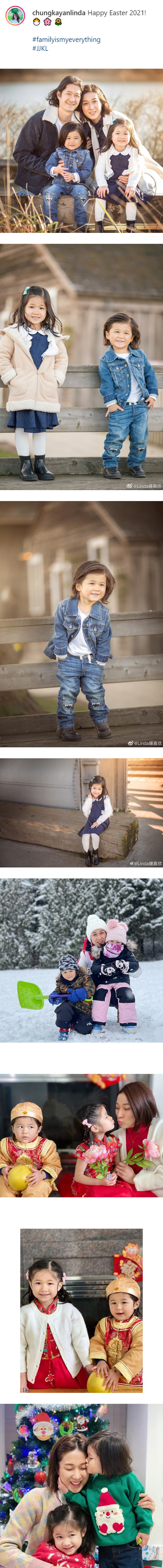 钟嘉欣在复活节这天,贴出一家四口的合照,照片中他们全员换上蓝白色系的装扮,其中儿子Jared留了一头长发和姐姐Kelly饼印一样,姐弟二人更像龙凤胎。