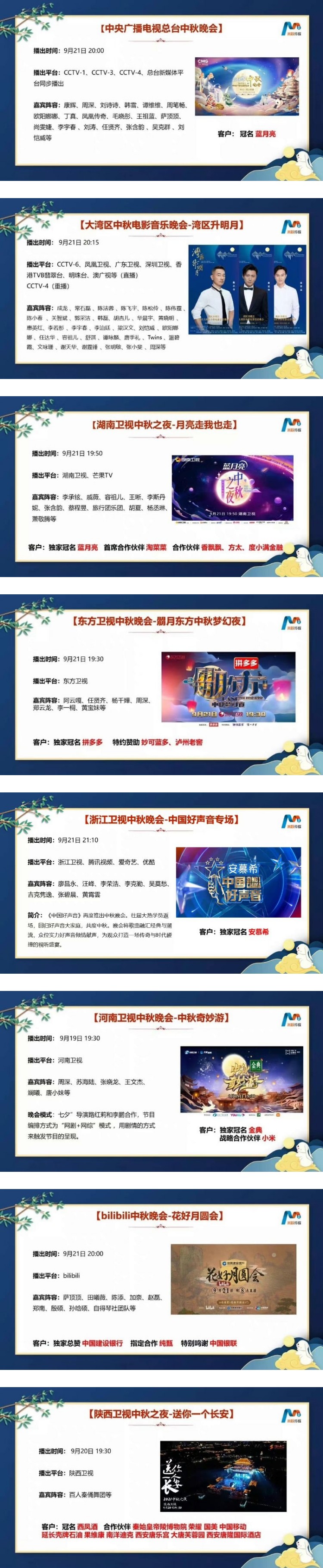 来看央视、大湾区、湖南卫视、东方卫视、浙江卫视、河南卫视、bilibili、陕西卫视已公开的第一波中秋晚会嘉宾阵容吧。