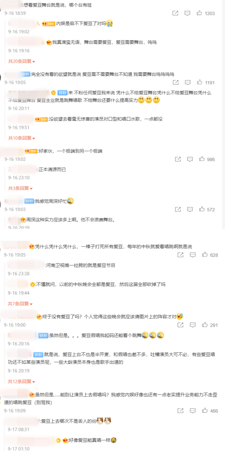 各大平台中秋晚会的阵容公开后,不少网友都傻眼质疑:“内娱是容不下爱豆了对吗”、“凭什么不给爱豆舞台,爱豆主业就是跳舞唱歌,不给舞台还要什么提高实力”、“凭什么凭什么凭什么,一棒子打死所有爱豆,每年的中秋就爱看唱跳啊就是说”。
