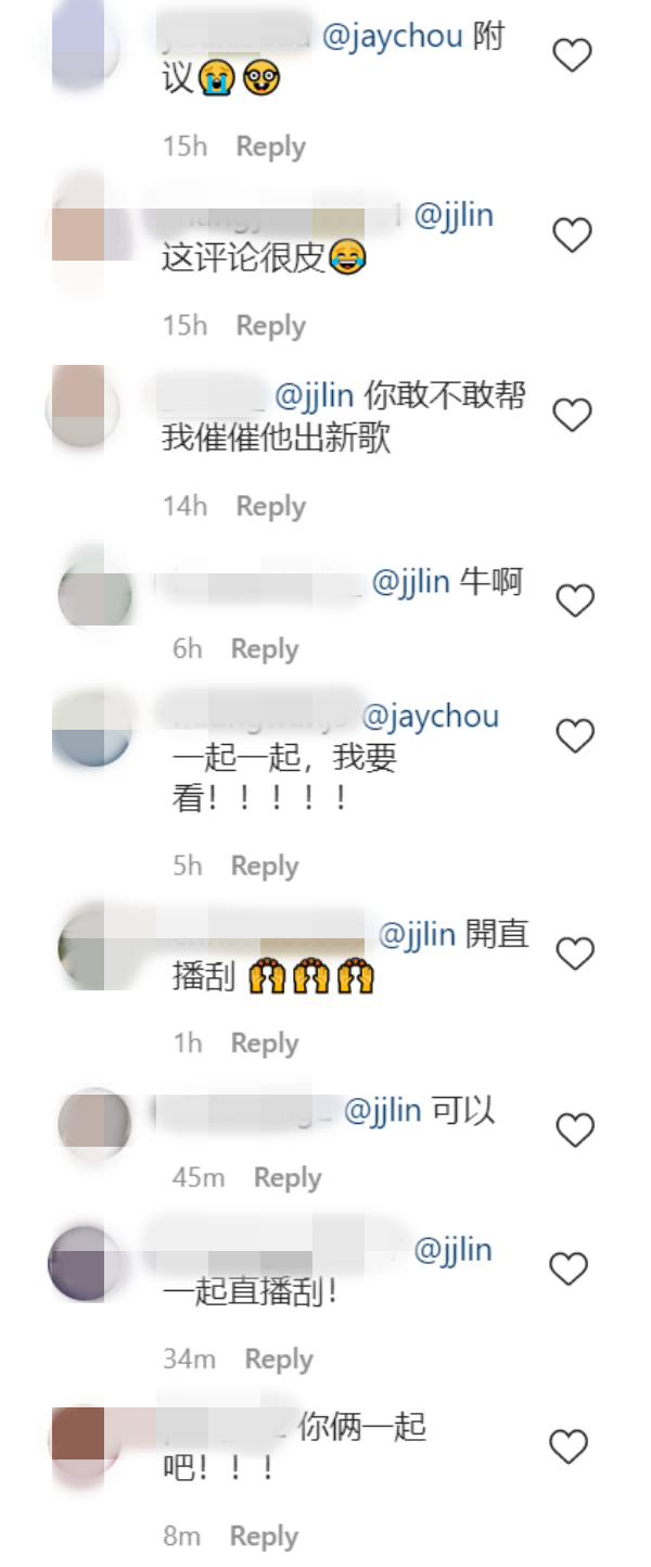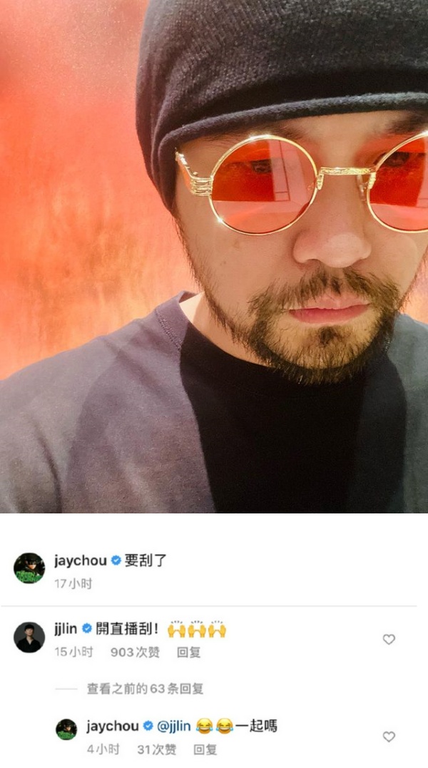 天王周杰伦和JJ林俊杰私下感情要好,近日周杰伦在Instagram贴出满脸胡子的照片,成功钓出林俊杰的留言,两人甚至还在讨论要不要一起直播刮胡子。