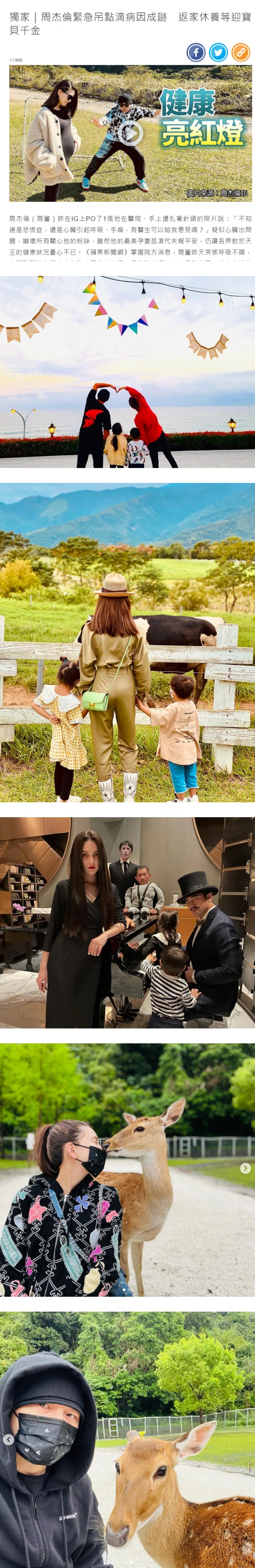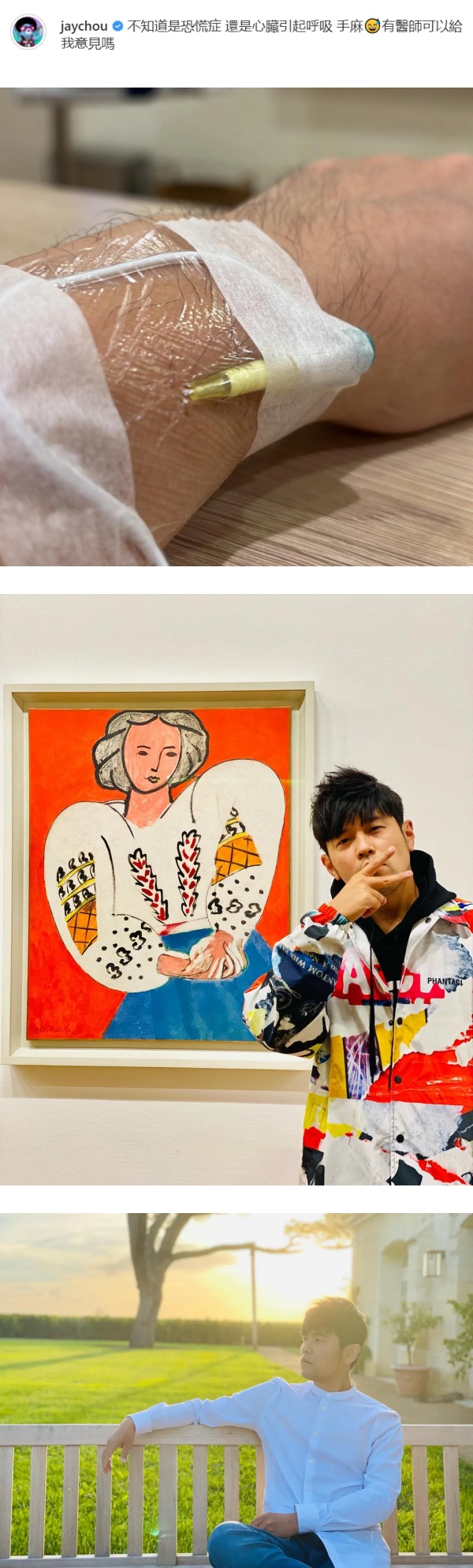 周杰伦晒照称,“不知道是恐慌症,还是心脏引起呼吸、手麻,有医生可以给我意见吗?”,事后太太昆凌在IG Story上代夫发文报平安,“周杰伦一切没事唷 谢谢大家的关心啦”。