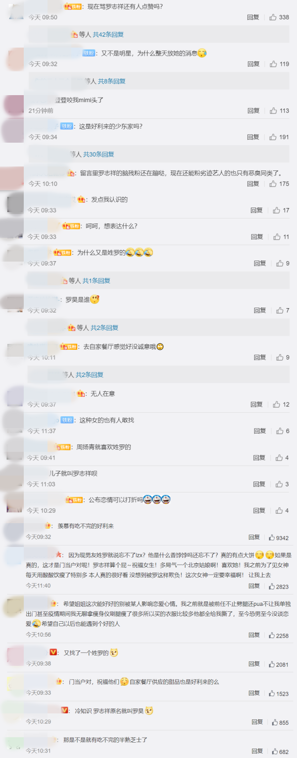 周扬青和罗昊约会被拍照片曝光后,引起网友热议,“ 又找了一个姓罗的”、“门当户对,祝福他们”、“这是好利来的少东家吗?”、“周扬青就喜欢姓罗的”等。