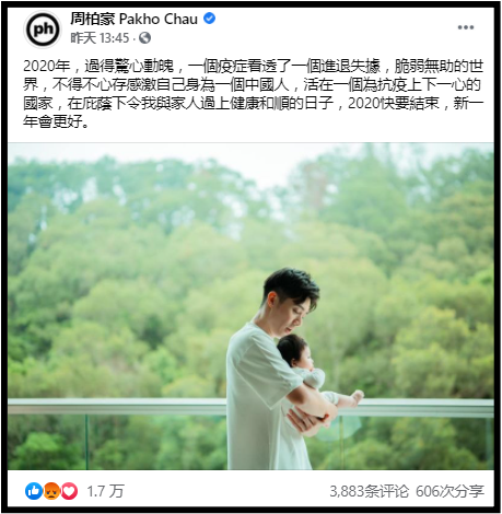 周柏豪去年曾因发文呼吁合格的香港市民登记为选民,被贴上“港独”标签,不受中国网友欢迎,经过一年多的沉淀,他日前在微博预告将加盟B站的跨年晚会,并在FB晒出与女儿的合照,其中写道,“不得不心存感激自己身为一个中国人,活在一个为抗疫上下一心的国家,在庇荫下令我与家人过上健康和顺的日子。”