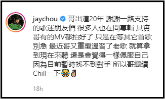 最近都在温习老歌的周杰伦其后笑说:“就算拿到现在来听,还是会觉得一样佩服自己,因为目前暂时找不到对手,所以哥继续Chill一下。”