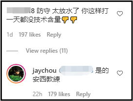 另一名网友则留言批评:“防守太放水了,你这样打一天都没技术含量”,而周杰伦则直接回怼:“是的,安西教练(《灌篮高手》中很严厉的教练)”,超调皮回复笑翻网友,纷纷表示:“杰伦捡到枪”。