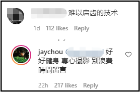 没想到却有网友留言酸:“难以启齿的技术”,周杰伦竟跑去看对方的IG后,留言回复:“好好健身,专心摄影,别浪费时间留言”。