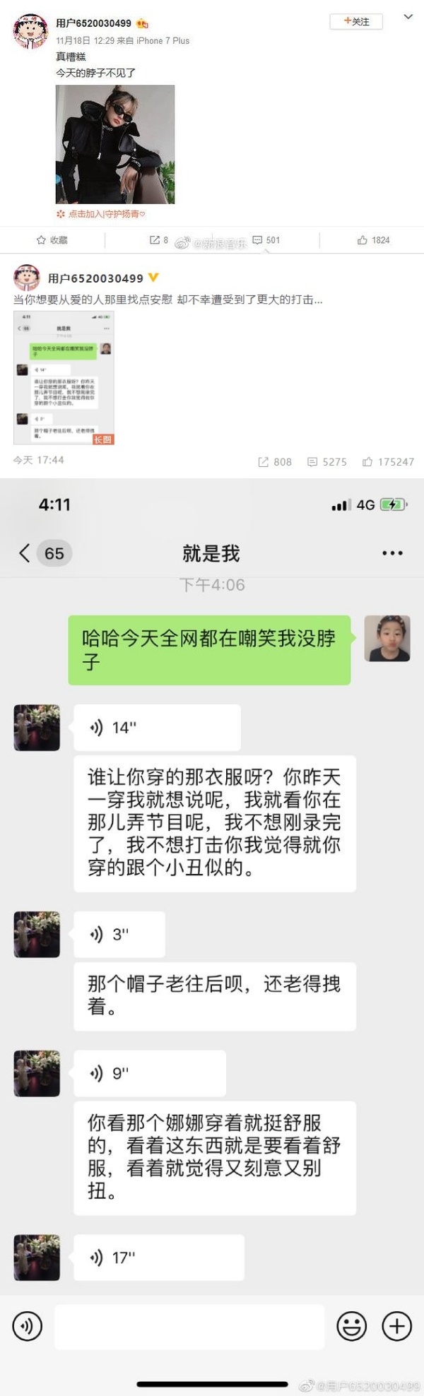 周扬青在小号晒出她和妈妈的对话,周扬青告诉妈妈说,全网都在笑自己没脖子,但没想到周妈妈竟然狠酸,“谁让你穿的那衣服呀?我不想打击你 我觉得你穿的跟个小丑似的。”;周妈妈如此狠心,周扬青忍不住说,“当你想要从爱的人那里找点安慰 却不幸遭受到了更大的打击… ”。