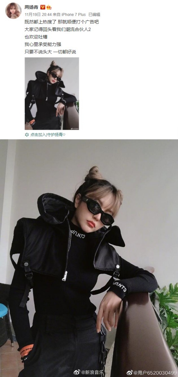 随后,她也在个人微博发文称,既然因脖子短这事上了热搜,就顺势卖广告,呼吁网友记得支持《潮流合伙人2》,“也欢迎吐槽 我心里承受能力强 只要不说头大 一切都好说”。