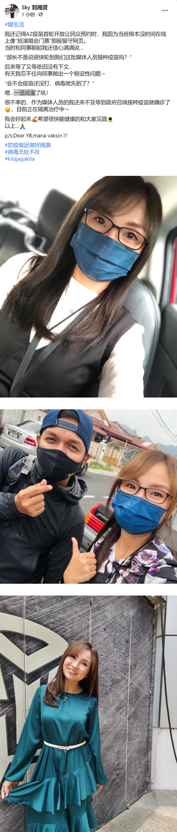 刘湘灵提到,自己还来不及等政府的疫苗安排已经确诊新冠肺炎,文末她忍不住写下一句,“Dear YB,mana vaksin I?”同时她也叮咛网友要做好防疫措施,病毒无处不在。