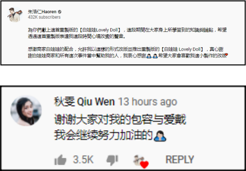 朱浩仁在影片的简介中写道:“这段期间在大家身上所学习到的知识与论点,希望透过这首重制版表达我这段时间心境改变的声音。”而秋雯则留言写道:“谢谢大家对我的包容与爱戴,我会继续努力加油的。”