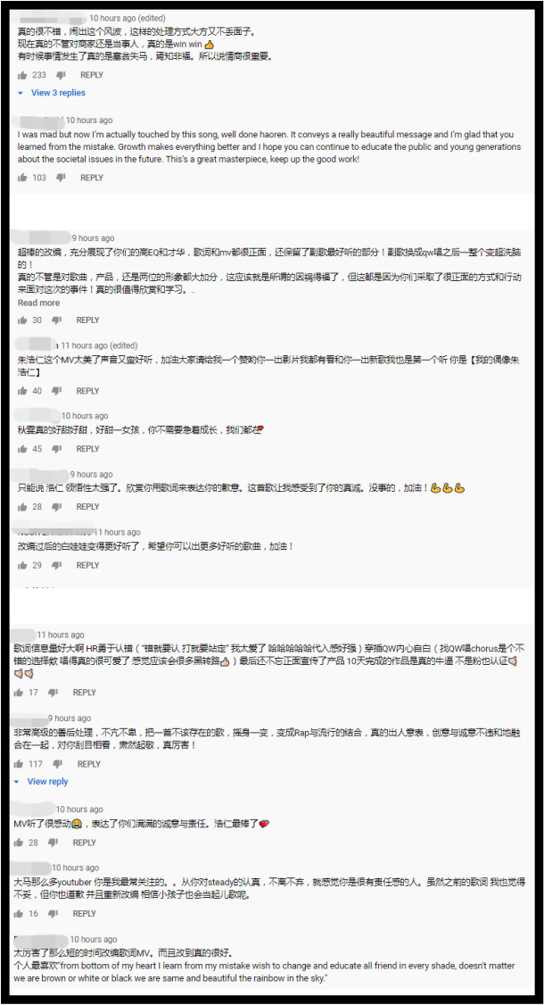 在MV的最后,朱浩仁、秋雯更是90度鞠躬,再次为此前的肤色歧视、粗话谐音而道歉。