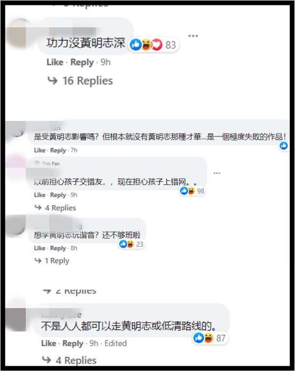 也有人怀疑朱浩仁是在效仿黄明志路线,更批评他:“想学黄明志玩谐音?还不够班啦”、“是受黃明志影响吗?但根本就沒有黃明志那种才华...是一個极度失败的作品”、“所谓近墨者黑,好人原本都不走这风格的也走偏了”、“不是人人都可以走黄明志或低清路线的。”