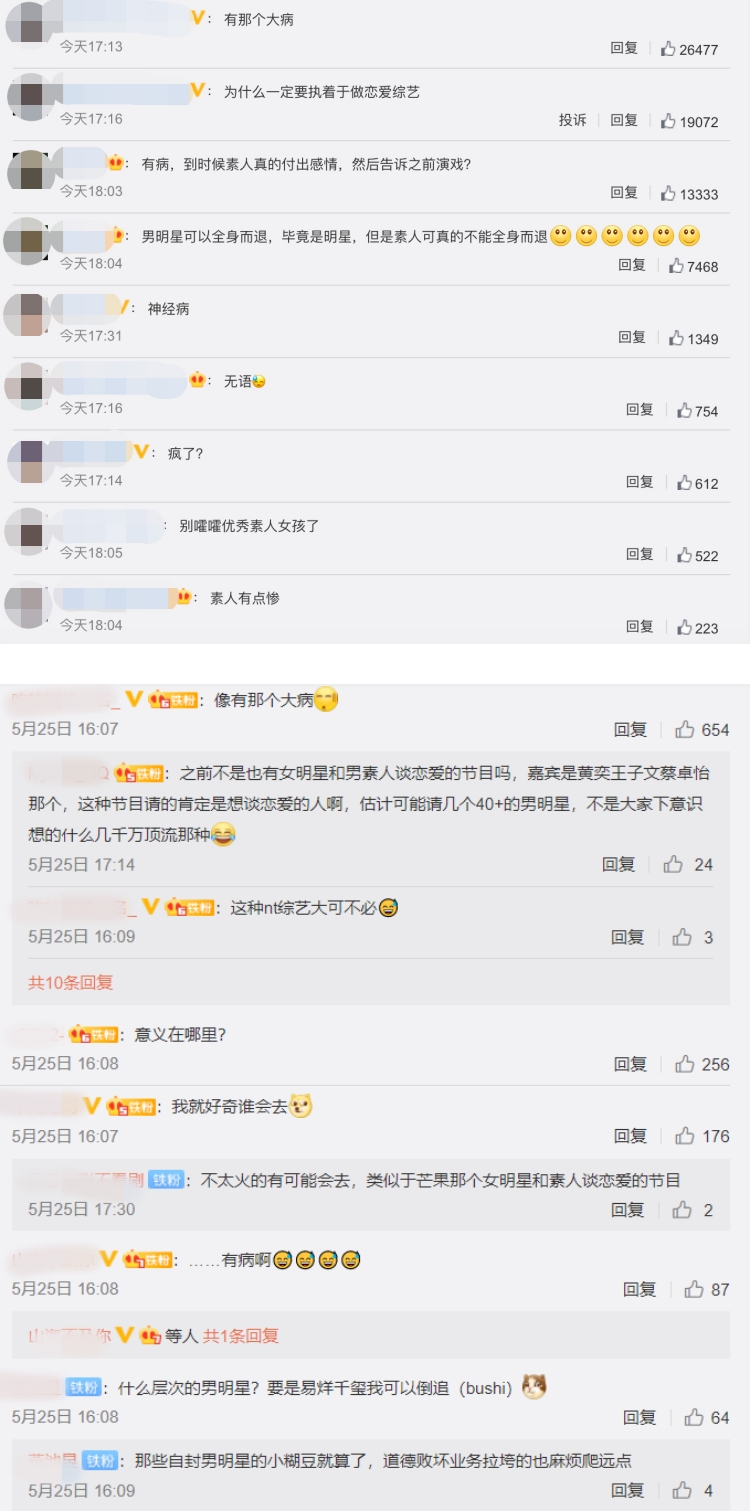 节目官宣后,不少网友都傻眼吐槽:“好家伙,让我亲眼见证我的爱豆如何一步一步走向塌房吗”、“男艺人可以携素人女友去公开了”、“有病,到时候素人真的付出感情,然后告诉之前是演戏”、“万一女素人当真了,而明星只是玩玩咋办”、“所谓素人要不是网红要不就是那种啥啥都很强的人吧,然后再拖到这个节目里被男艺人的粉丝骂一骂”、“素人女性图啥啊,被男明星粉丝辱骂扒皮网暴吗?”