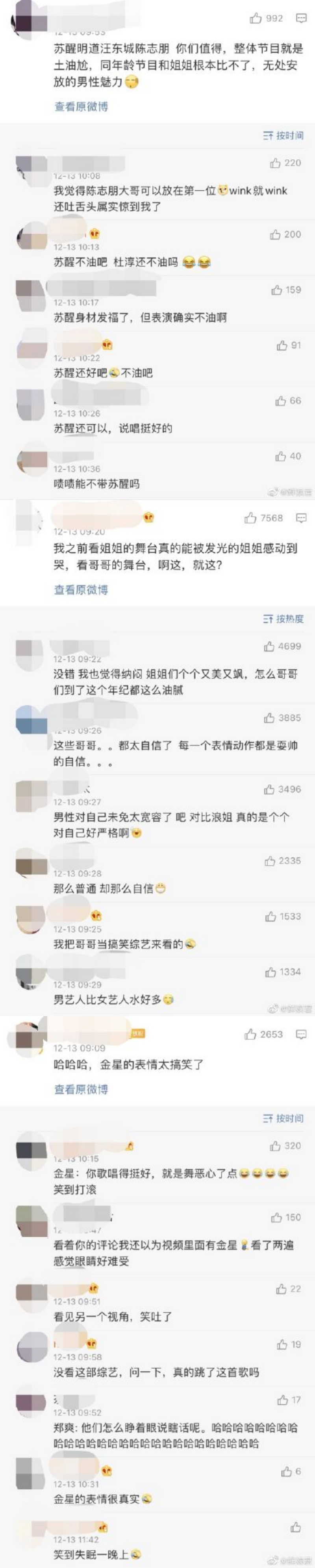 节目播出后,“去油吧哥哥”迅速登上微博热搜,不少网友吐槽:“我也觉得纳闷,姐姐们个个又美又飒,怎么哥哥们到了这个年纪都这么油腻”、“那么普通,却那么自信”、“一个比一个油”、“是中石油特别需要的程度”。