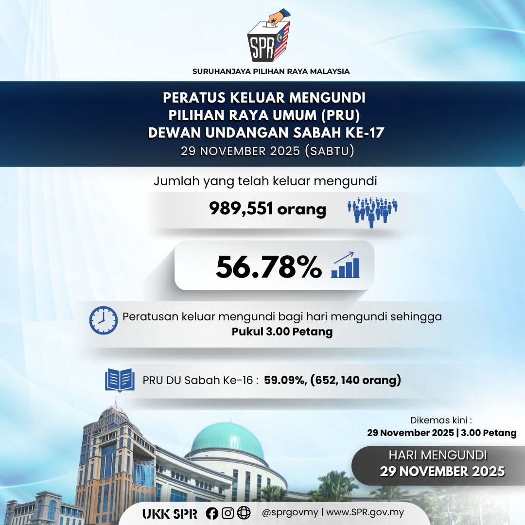 选举委员会宣布,截至下午3PM,投票率为56.78%,共有989,551名选民已经投票。不过,这一投票率仍低于上届州选同时间段59.09%的记录。
