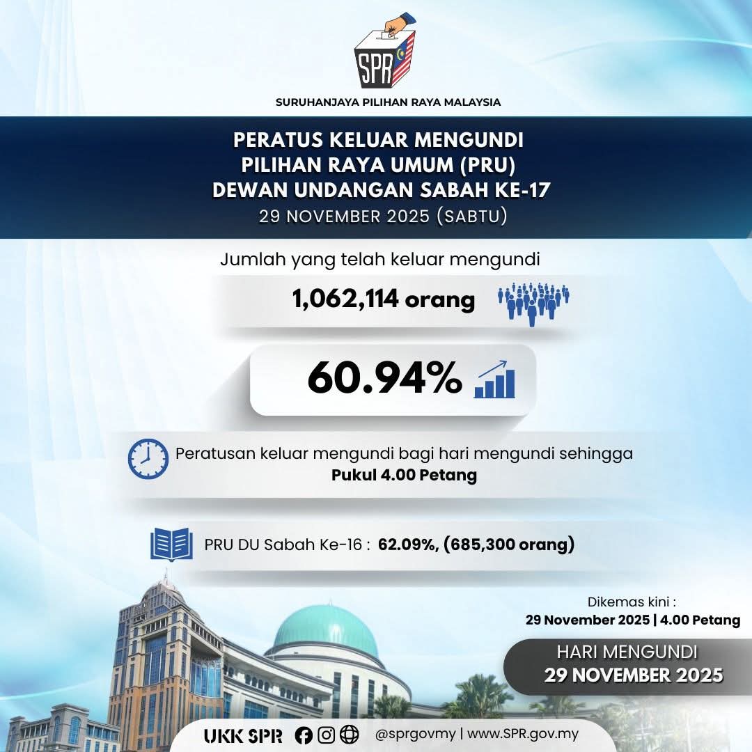 截至4PM,选举委员会的数据显示,投票率达到 60.94%,已有 1,062,114 名选民完成投票。相比之下,上届州选同一时间段的投票率为 62.09%,本届投票率略落后。