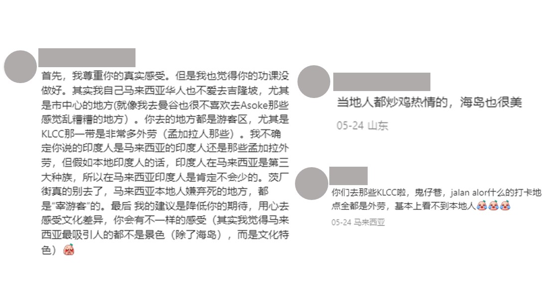 “首先,我尊重你的真实感受,但是我也觉得你的功课没做好……茨厂街真的别去了,马来西亚本地人嫌弃死的地方,都是‘宰游客’的。我建议降低你的期待,用心去感受文化差异,你会有不一样的感受。”