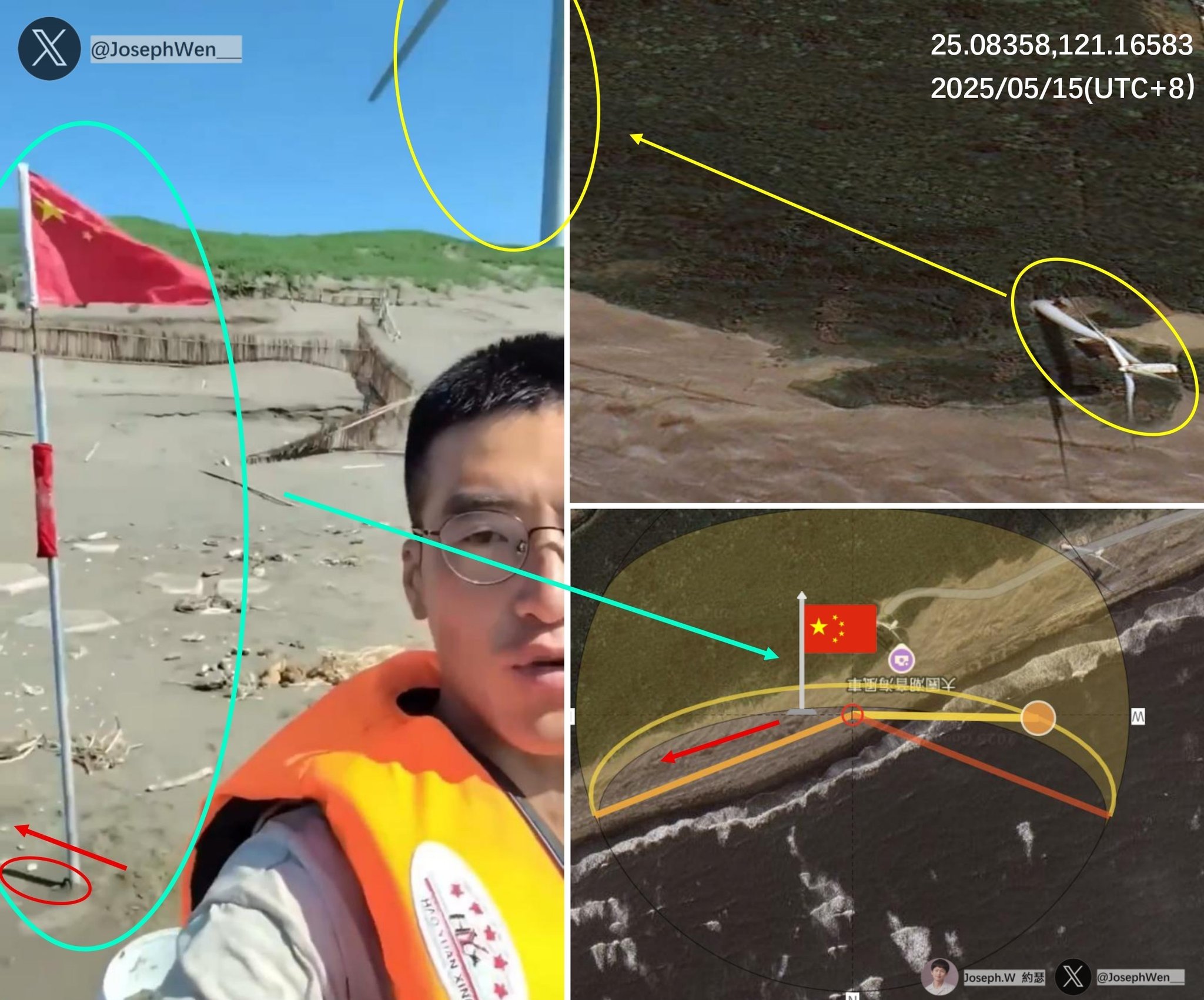 经台湾网友比对,视频中的地貌与大园区滩岸相符,中国国旗旗杆的阴影方位也与登陆时间相符。 pic.twitter.com/631UTGNRtk