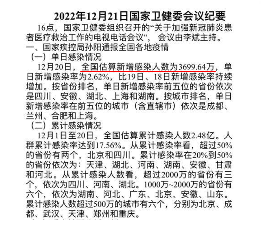 根据该会议纪要,中国在12月20日的单日新增病例就达到了3,700万人,比官方数据记录的3,101例,多出了超过3,000万宗。
