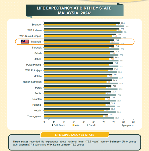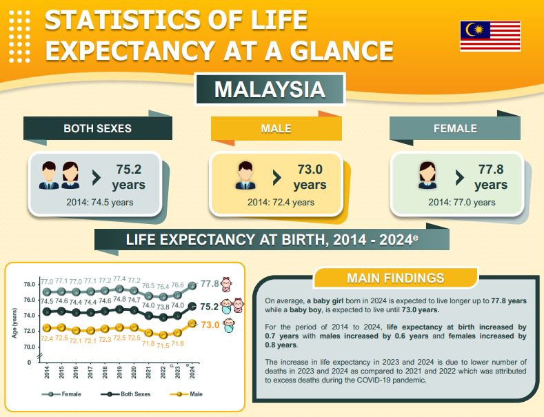 大马统计局今天发布的《2022年至2024年生命报告》中,涵盖了我国在2022年至2024年,按照年龄、种族、性别划分的全国和州属人民预期寿命。