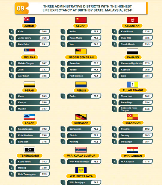 若再细分各州行政地区情况,雪州八打灵的人民预期寿命最高(80.2岁),接着是砂拉越三马拉汉(79.9岁)、沙巴京那巴当岸(79.2岁)、沙巴亚庇(79岁)、雪州雪邦(78.5岁)。