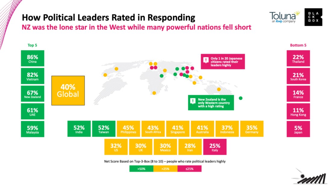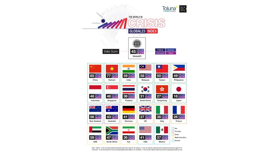 新加坡民调机构Blackbox Research与科技公司Toluna合作进行了一项调查,其中访问了全球23个国家和地区的民众,并了解了他们对自己政府应对新冠肺炎(COVID-19)疫情的看法,当中采用的4个指标包括政治领导丶企业领导丶社会和传媒。
