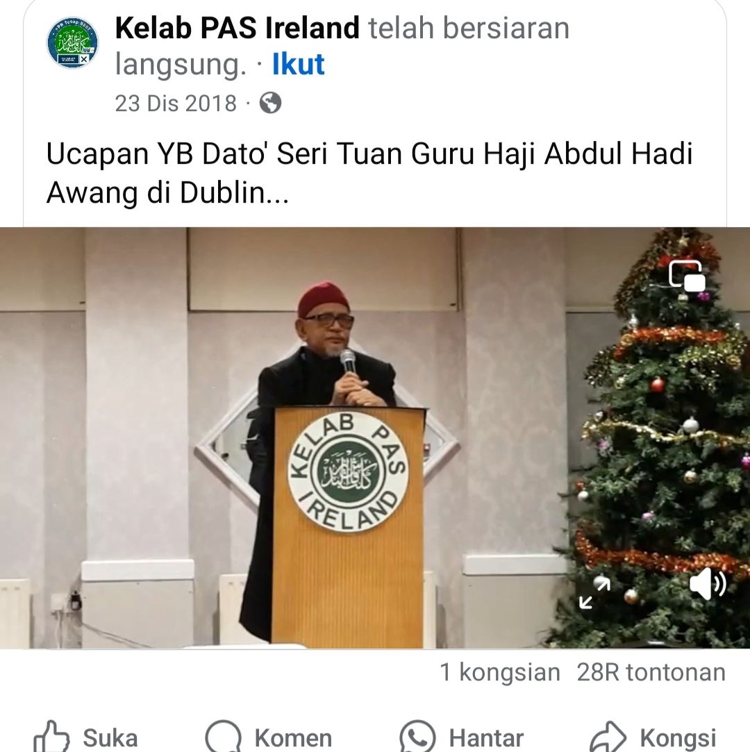 有网民找出伊党主席哈迪阿旺在2018年演讲时,讲台旁边装饰了一棵圣诞树,并配文表示“可能那是一棵红树林树吧”。