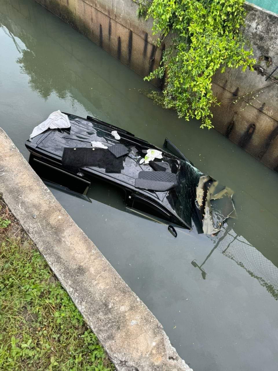 车子遭沟渠水没顶 车内3人全受困