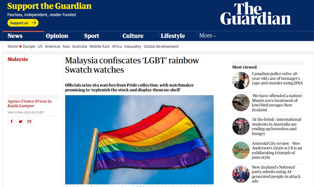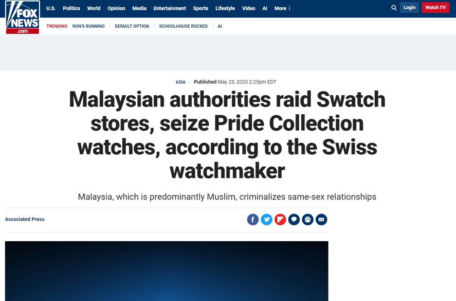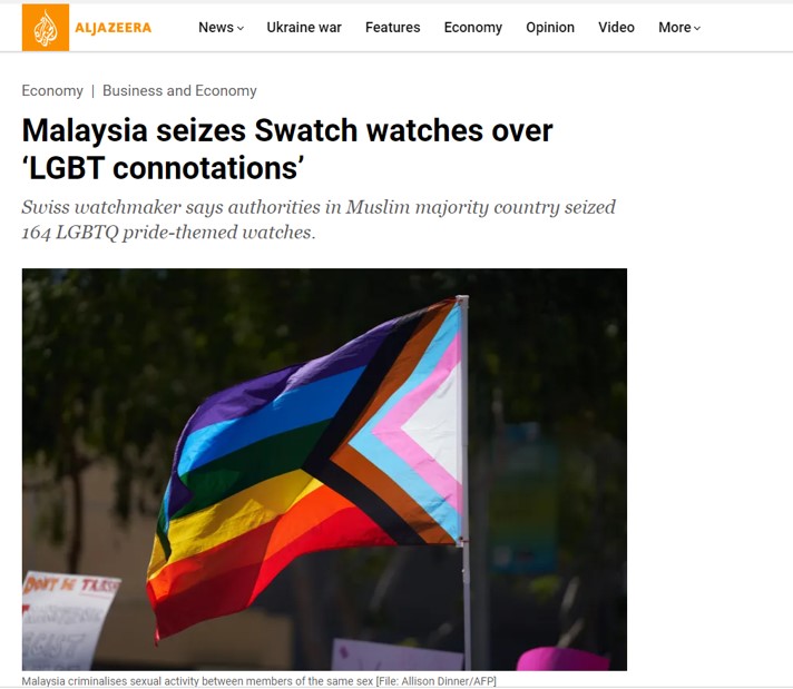 而Swatch则因旗下其中一款以彩虹为主题的“Pride”系列手表,被指宣扬性少数平权(LGBTQIA+),而遭内政部官员充公该系列手表。
